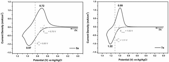 The electrochemical property of the PAs and PIs was investigated by cyclic voltammetry (CV) with the cast films on ITO-glass in 0.1 M TBAP (Bu4NClO4)/acetonitrile (MeCN) solution. An Ag/AgCl in saturated KCl solution was used as a reference electrode (calibrated externally using a 5 mM solution of ferrocene/ferrocenium couple). The oxidation half-wave potential (E1/2Ox) of ferrocene was found as 0.44 V vs. Ag/AgCl (see Figure S9, Supplementary Materials). The typical CV diagrams of representative PA 5a and PI 7a are depicted in Figure 8, and those of the other polymers are included in the Supplementary Materials (Figures S10 and S11). The oxidation potentials of the polymers are summarized in Table 3. The half-wave potentials (E1/2) of the polymers were recorded in the ranges of 0.81−0.86 V (for the PAs) and 1.09−1.11 V (for the PIs). It is reasonable that the PIs showed a significant anodic shift of the potential in comparison to their PA counterparts due to the presence of electron-withdrawing imide units. Upon oxidation, the polymer films changed color from colorless to greenish blue or blue. The HOMO (highest occupied molecular orbital) energy levels of the polymers were calculated from cyclic voltammetry and by comparison with ferrocene (5.1 eV) [47]. These data, together with absorption spectra, were then used to obtain the LUMO (lowest unoccupied molecular orbital) energy levels (Table 3).