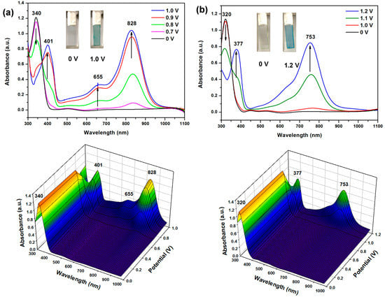 In order to measure the optical properties in detail, the changes in the optical absorption profile of the polymer films coated on ITO electrode were recorded in situ to elucidate the electro-optical properties. The UV–vis–NIR absorption spectral change of PA 5b and PI 7a films at various applied potentials are illustrated in Figure 9. The spectroelectrographs of other polymers are given in the Supplementary Materials (Figures S12−S16). In the neutral state, the PA films exhibited a strong absorption centered at 320−352 nm, due to the π−π* transitions. Take 5b as an example. When the applied potential was increased to 1.0 V, the π−π* transition band at 340 nm gradually decreased while new absorption bands at 401, 655, and 828 nm gradually appeared, attributed to the formation of charge carriers. The spectral changes can be easily followed by color change from colorless to greenish blue during doping. Therein, semi-aromatic polymers show a slight blue shift, because the conjugate length is shorter than the wholly aromatic polymer, therefore the color change from greenish blue to blue upon oxidation. PI 7a showed a similar spectral change upon electro-oxidation; however, the absorption maxima at its doped state exhibited a slight blue shift as compared to PA 5b.
