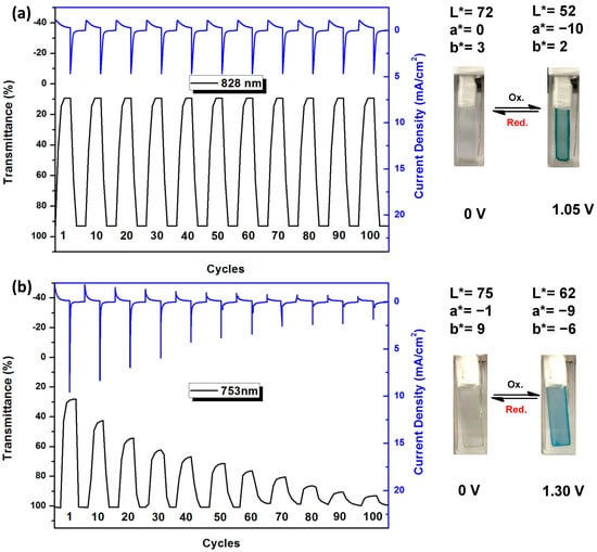 The percentage transmittance change (Δ%T) between neutral (at 0.0 V) and oxidized (at 1.05 V) states of the PA 5b film was up to 84% at 828 nm. PA 5b attained 90% of a complete blue-green coloring in 3.77 s, as shown in Figure S17 (Supplementary Materials). In contrast, PI 7a attained 90% oxidized blue states in 4.33 s. The electrochromic coloration efficiency (CE) value of PA 5b was found to be 186 cm2 C−1 at 828 nm by chronoamperometry. PI 7a showed a slightly lower CE value of 133 cm2 C−1 at 754 nm.