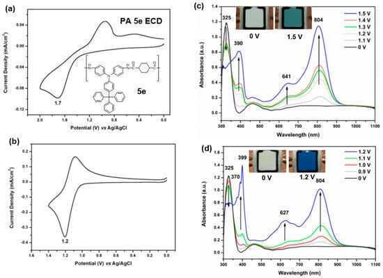 (a) Cyclic voltammetry (CV) diagram of the Electrochromic Devices (ECD) (ITO/PA 5e film/gel electrolyte/ITO) based on the cast film (thickness: 250 ± 30 nm) of PA 5e on the ITO-coated glass substrate; (b) CV diagram of the ECD based on PA 5e/HV; (c) Spectra and color change of the ECD based on PA 5e at indicated applied voltages; (d) Spectra and color change of the PA 5e/HV ECD at indicated applied voltages. The semi-gelled electrolyte consists of 10-wt % PMMA (average Mw = 120,000) in 0.6 M LiBF4/propylene carbonate.