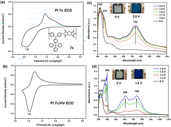 (a) CV diagram of the ECD (ITO/PI 7c film/gel electrolyte/ITO) based on the cast film (thickness: 250 ± 30 nm) of PI 7c on the ITO-coated glass substrate; (b) CV diagram of the ECD based on PI 7c/HV; (c) Spectra and color change of the ECD based on PI 7c at indicated applied voltages; (d) Spectra and color change of the PI 7c/HV ECD at indicated applied voltages. The semi-gelled electrolyte consists of 10-wt % PMMA (average Mw = 120,000) in 0.6 M LiBF4/propylene carbonate.