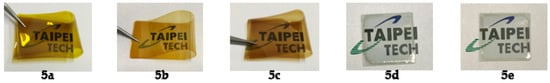 According to the phosphorylation technique described by Yamazaki and co-workers [45], a series of polyamides 5a–5e were synthesized from the diamine monomer 3 with various aromatic or aliphatic dicarboxylic acids (4a−4e) by means of TPP and pyridine (Scheme 2). As shown in Table 1, the obtained PAs had inherent viscosities in the range of 0.35−0.62 dL g−1. Polyamides 5a–5c can be solution-cast into flexible and transparent films (see photos shown in Scheme 2), indicating the formation of high molecular weight polymers. Although 5d and 5e have relatively lower inherent viscosities, they can still be casted into robust films on the glass substrates. Their cast films are highly transparent and colorless. The structures of the PAs were confirmed by IR and NMR spectroscopy. Figure S4 (Supplementary Materials) shows the IR spectra of PAs 5a−5e. All of the PAs showed the characteristic absorption bands of the amide group at around 3315 cm−1 (N−H stretching) and 1664 cm−1 (amide C=O). As a typical example, Figure S5 shows the 1H and H−H COSY spectra of polyamide 5a. All of the resonance signals could be well assigned to the hydrogen atoms in the repeating unit. The resonance peak appearing at 10.37 ppm in the 1H NMR spectrum also verifies the formation of amide linkages in the polymer main chain.