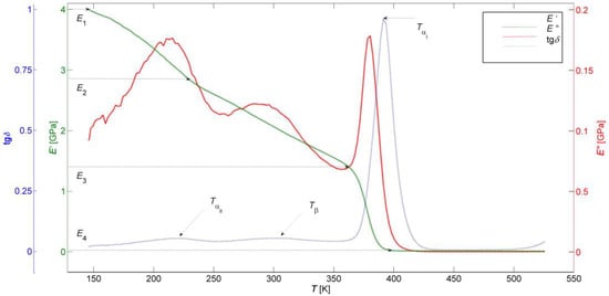 The DMA test measurements were carried out using a Perkin Elmer Pyris Diamond 8000 Dynamic Mechanical Analyzer (Perkin Elmer, Baesweiler, Germany) in the uniaxial tensile mode at a constant frequency of dynamic mechanical loading of 1 Hz, with an amplitude of 20 μm from −125 up to 250 °C and at a constant heating rate of 3 °C·min−1. The amplitude of applied dynamic stress was 0.1 MPa and the strain rate was 0.1 s–1. The strain measurements were performed by a linear variable differential transformer in the DMA equipment with a span of 2 mm and a mean resolution of 2 nm. The measurements were performed on ten specimens cooled by liquid nitrogen from a Dewar flask (Perkin Elmer, Baesweiler, Germany). The average values of E′, E′′, and tan δ for each temperature T were computed. The measurement uncertainty was approx. 2%. The experimental results of DMA tests of the examined material in the form of temperature dependencies of the average storage modulus E′(T), loss modulus E′′(T), and damping factor tan δ(T) at a single constant frequency of dynamic mechanical loading of 1 Hz in the whole temperature range of its service life are presented in Figure 1. The frequency of 1 Hz was chosen due to the fact that the secondary transitions and other structural features of the tested material could be easily detected, and the obtained results could be in the case of need more easily related to the experimental data acquired with the use of other techniques (e.g., by DSC method [27]). Figure 1 shows also highlighted critical values of the storage modulus E′1 – E′4 and temperatures of relaxation events TαII, Tβ, TαI occurred in the tested TPU samples. In connection with the above described stiffness-temperature analysis of experimental data, the temperatures in the diagram in Figure 1 are presented in the absolute scale.