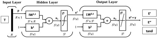 The ANN architecture for modeling the temperature dependencies of all three observed visco-elastic parameters is in an abbreviated notation [32], schematically shown in Figure 2. The input vector p in our case for all three generated ANN models represents a vector of the temperature history T of the TPU during its DMA test, while the output signal y of the network for individual models are the vectors of the corresponding values E′(T), E′′(T), or tan δ(T) at temperatures, T(t) predicted by the network. Vectors and matrices are in this work marked in straight bold fonts.