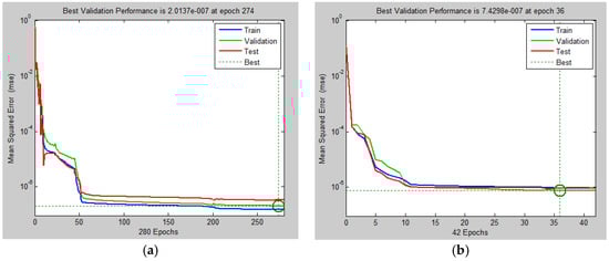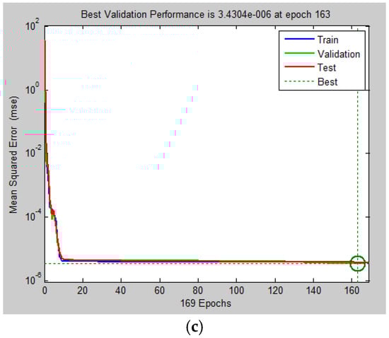 The ANNs do not usually enable a calculation of statistical parameters and diagnostics for a detailed assessment of the model quality, with the use of for example variance of regression coefficients, F and t statistics for the testing the significance of the model, diagnostic graphs, etc., as it is in the case of parametric regression models of experimental data [47]. For this reason, it is necessary to use different methods for the assessment of quality of the ANN model [48]. In this work, in order to validate the ability and accuracy of the modeled results related to all of three investigated visco-elastic parameters, first of all of the performance plots of the ANN models have been constructed and they are shown in Figure 3. These plots show how the MSE function minimizes during the training process. After six validation checks the network stops its training and returns to the state, in which the minimum validation performance was observed. This is indicated by the green circle in each figure. It follows from the plot in Figure 3a that the best validation performance of the ANN model for E′(T) occurred at the epoch 163 with the associated MSE value of 3.4304 × 10−6, for E′′(T) at the epoch 36 with MSE value of 7.4298 × 10−7 (Figure 3b) and for tan δ(T) at the epoch 274 with MSE value of 2.0137 × 10−7 (Figure 3c). The final MSE of all three ANN models is rather negligible, the training data set MSE, the validation data set MSE, as well as the test data set MSE have similar characteristics. No significant overfitting has occurred by iteration (where the best validation performance has occurred), which has indicated the achievement of excellent results for both the approximation and the prediction of values of the investigated functions [49]. However, the training of the ANN model for E′′(T) is the least time-consuming, as this model converges to the minimal MSE value already in the epoch 36 of the training process, while the most time-consuming training of the ANN model for tan δ(T) converges to the MSE minimum only in the epoch 274.
