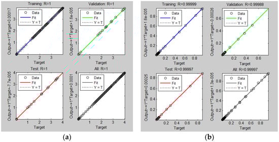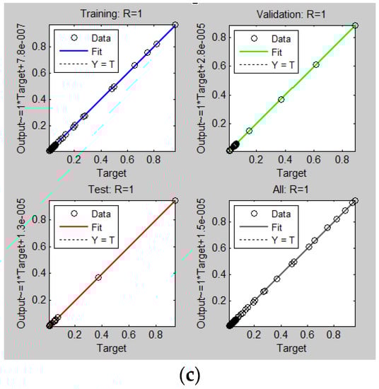 The MSE function is a performance measurement adopted to determine the ANN performance, while R values measure the correlation between the outputs and targets. In Figure 4, the linear regression plots of targets relative to outputs or fitness plots for all three data sets of the ANN (training, validation, and testing) and entire data used in the network models for E′(T) (Figure 4a), E′′(T) (Figure 4b), and tan δ(T) (Figure 4c) are presented. In the top and left part of these figures the R values and equations of linear fit lines in the format