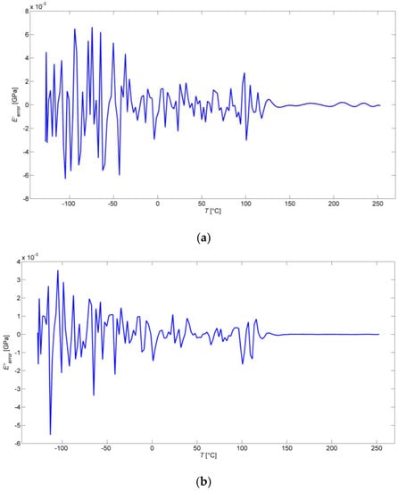 The difference between the experimental and modeled values of E′(T), E′′(T), and tan δ(T) are presented in Figure 5, in detail. It can be seen that error of all three ANN models on the level of the order of 10−3 is negligibly small in comparison with the experimental data acquired from the DMA tests.