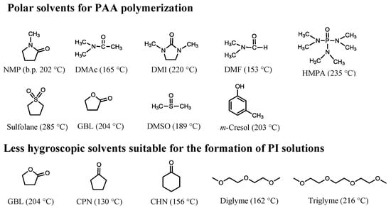 The choice of solvents is also important. Figure 1 shows the solvents that are often used in the polymerization of PI precursors [poly(amic acid) (PAAs)] and for the formation of PI solutions by dissolving the chemically imidized powder samples. The abbreviations of the solvents are shown in the figure caption. N-Methyl-2-pyrrolidone (NMP) is usually used for PAA polymerization because of its higher dissolution ability and lower toxicity than other polar solvents. However, amide solvents such as NMP tend to cause appreciable film coloration, probably owing to the generation of unknown colored products by oxidation at elevated temperatures. NMP is also disadvantageous compared to DMAc regarding film coloration. When PI films are prepared via the conventional two-step process [precursor casting + thermal imidization (cyclodehydration)] under vacuum, empirically speaking, the degree of coloration in the resultant PI films, which are originally colorless, decreases in the following order: HMPA >> NMP > DMAc ≥ GBL and triglyme. This trend is probably related to their oxidative stability and the difficulty in evaporation from the film during thermal imidization (i.e., the period that the solvent remains in the films). The latter is dominated by the combined effect of their boiling points and the strength of the PAA–solvent and PI–solvent interactions. Based on our experience, HMPA should not be used. For example, 1,2,3,4-cyclobutanetetracarboxylic dianhydride (CBDA) and trans-1,4-cyclohexanediamine (t-CHDA) could be polymerized only in a mixed solvent of HMPA and DMAc [17]. However, when the precursor cast film including the solvents was thermally imidized on a substrate under vacuum, unexpectedly, a black-colored film was formed, probably owing to the formation of a strongly colored unknown product by partial thermal decomposition of HMPA. Therefore, a solvent extraction process is indispensable for avoiding such prominent coloration before thermal imidization [17].