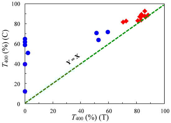 Effect of imidization method [chemical imidization (C) and thermal imidization (T)] on light transmittance at 400 nm (T400). (●) PEsIs derived from substituted TA-HQ and TFMB and (♦) H″-PMDA-based PIs. The dotted line denotes the relationship: Y = X. Reproduced with permission from Elsevier [21].