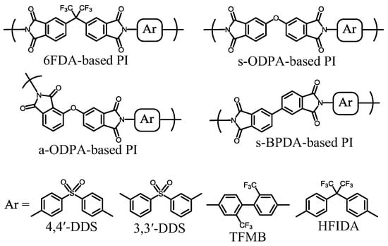 Thus, to reduce film coloration, it is effective to introduce electron-withdrawing groups to aromatic diamines, and by contrast, electron-donating groups to aromatic tetracarboxylic dianhydrides. Some of the practically useful aromatic PIs with no or low coloration are shown in Figure 5 together with the monomer abbreviations in the caption. Indeed, these PIs are obtained using the diamines containing the electron-withdrawing –CF3 and –SO2– groups [14] and using the tetracarboxylic dianhydrides with the electron-donating –O– group. Similarly, aromatic diamines with electron-withdrawing halogenic substituents (Cl and F) directly connected to the aromatic units are also expected to be effective in reducing film coloration. However, in contrast to thermally stable CF3-connecting diamines such as 2,2′-bis(trifluoromethyl)benzidine (TFMB), corrosion triggered by the halogenic species, which may be yielded at elevated temperatures, is a concern.