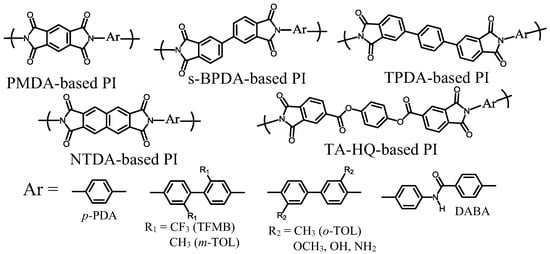 The structures of aromatic PI systems leading to low-CTE property by two-step method. PMDA = pyromellitic dianhydride, TPDA = 3,3″,4,4″-p-terphenyltetracarboxylic dianhydride, NTDA = 2,3,6,7-naphthalenetetracarboxylic dianhydride, TA-HQ = hydroquinone bis(trimellitate anhydride), p-PDA = p-phenylenediamine, m-TOL = m-tolidine, o-TOL = o-tolidine, DABA = 4,4′-diaminobenzanilide.