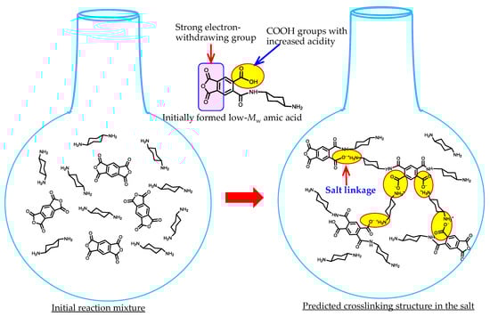 A schematic illustration of salt formation in the initial stage of PAA polymerization in anhydrous amide solvents. The PMDA/t-CHDA system is shown here as an example.