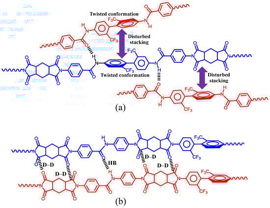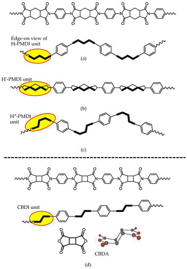 The biphenyltetracarboxydiimide (BPDI) units in 3,3′,4,4′-biphenyltetracarboxylic dianhydride (s-BPDA)-based PIs are electronically conjugated through the biphenyl linkage. Therefore, if each phthalimide plane in the BPDI unit is almost orthogonally distorted, the coloration of the PI films can be reduced. In fact, in the isomeric 2,3,3′,4′-BPDA (a-BPDA)-based PIs, a hypsochromic and hypochromic effect in the UV-vis absorption spectrum is observed, probably owing to the biphenyl distortion arising from steric hindrance between the 2-imide C=O group and 2′-hydrogen atom at the a-BPDA-based diimide units [28].
