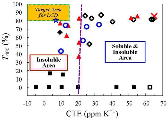 Figure 7 exemplifies the optically transparent and low-CTE PI systems that we have developed so far. In addition, we have studied solution-processable, colorless polybenzoxazole (PBO) systems [62,63], but these are not described here in detail. The optically transparent low-CTE PIs can be classified into four categories: a wholly cycloaliphatic PI (CBDA/t-CHDA) [17], semi-cycloaliphatic PIs derived from rigid tetracarboxylic dianhydrides and t-CHDA [17,45], semi-cycloaliphatic PIs derived from cycloaliphatic tetracarboxylic dianhydrides with rigid structures and aromatic diamines [36,45,51], and wholly aromatic PEsIs [21] and poly(amide imide) (PAI) [15]. The selected properties of these systems are summarized in Table 1. The detailed problems that we have encountered in these systems will be discussed later.