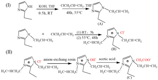 In brief, 2-ethylimidazole (2.46 g) and potassium hydroxide (0.96 g) were dissolved in 30 mL tetrahydrofuran (THF), to which allyl chloride (the molar ratio of 2-ethylimidazole:allyl chloride = 1:1.2) was added. After 48 h of reaction at 55 °C, the solid impurities of the above system were filtered out. The product of 1-allyl-2-ethylimidazole (A) with the yield of 86% was obtained by removing unreacted allyl chloride via rotary evaporation. Then, a slight excess of allyl chloride was added slowly to the above product with the molar ratio of 1.1:1. After reaction for 5 h at room temperature, the system was heated up to 55 °C and continued to react for 48 h. The product was repeatedly washed with absolute ether to remove the unreacted reactant (A). Finally, the product of 1,3-diallyl-2-ethylimidazolium chloride (B) with the mass yield of 83% was obtained after removal of allyl chloride and ether via rotary evaporation (Figure 1I).