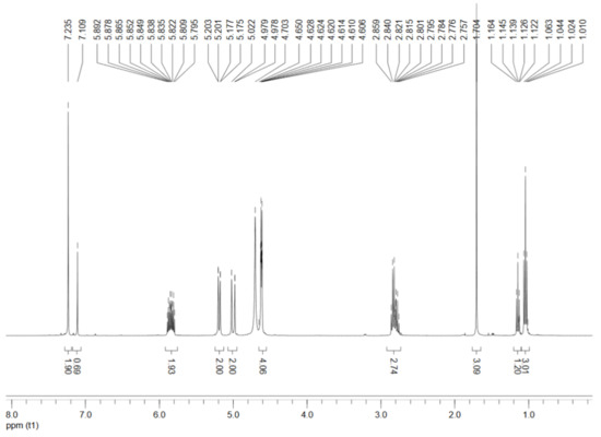 The FT-IR spectra of the synthesized 1,3-diallyl-2-ethylimidazolium acetate and 1,3-diallyl-2-ethylimidazolium chloride can be seen in Supplementary Materials Figure S2. Furthermore, the structure of the synthesized 1,3-diallyl-2-ethylimidazolium acetate was confirmed by 1H-NMR (Figure 2). The 1H-NMR spectra of the IL were collected from a Bruker Avance-400 NMR spectrometer operating at 400 MHz. Before use, the synthesized IL was completely dissolved in the solvent of D2O at room temperature. The 1H-NMR data of the IL is listed as follows. 1H-NMR (400 MHz, D2O): δ (ppm) 1.0 (t, 3H, -CH2-CH3) [33], 1.8 (s, 3H, CH3-COO−), 2.8 (m, 2H, -CH2-CH3), 4.6 (s, 4H, =CH-CH2-N+ and N-CH2-CH−), 5.1 (d, 4H, CH2=CH- and -CH=CH2), 5.8 (m, 2H, CH2=CH-CH2- and -CH2-CH=CH2), 7.2 (s, 2H, -CH=CH in imidazole ring).