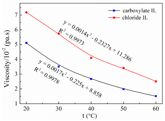The solubilities of IL with some polar and non-polar organic solvents were listed in Supplementary Materials Table S1. Figure 3 shows the viscosities of the developed chloride IL (B) and carboxylate IL (C) at different temperatures.