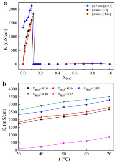Figure 4b showed the electric conductivities of 1,3-diallyl-2-ethylimidazolium acetate with different levels of water content and temperature. It is quite evident that the conductivities of all the IL-water systems increased as the temperature (from 30 °C to 70 °C) and water content (from 0.04 to 0.10) increased. This could be explained as follows: on the one hand, dissociation is an endothermic process and increasing temperature could improve the ionic dissociation ability of the system and enhance the activity of ions. On the other hand, with the increase of temperature and the molar fraction of the solvent, the viscosity of the IL-water system was greatly reduced, which was favorable for the migration of ions. However, due to the effect of dilution, the electric conductivities began to decrease when the water content increased to 0.12. This result is in good agreement with that obtained in Figure 4a.
