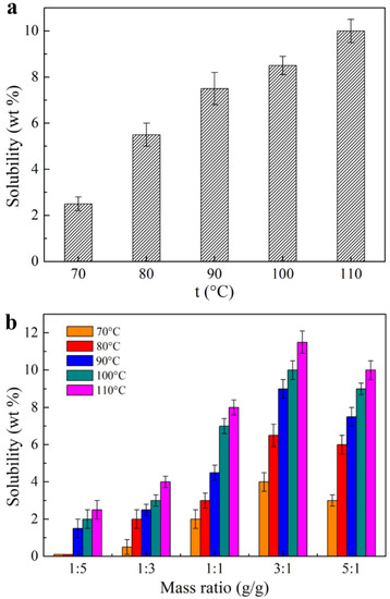 Figure 5 shows the dissolution behavior of bamboo dissolving pulp cellulose in the developed [AAeim][OAc] and [AAeim][OAc]/DMSO co-solvent system, respectively. As shown in Figure 5a, the solubility (g per 100 g of IL) of cellulose in the developed IL increased almost five times as the temperature increased from 70 °C to 110 °C. This is because the viscosity of the IL decreases as temperature increases, which is favorable to the swelling and diffusion of cellulose in the [AAeim][OAc] solvent. Moreover, the temperature increment also contributes to breaking the old hydrogen bonds of cellulose, thereby enhancing its solubility. However, the solubility of cellulose in this IL is slightly lower than in the currently reported IL solvent such as [C4mim][OAc] and [Amim][OAc]. It may be due to the self-polymerization of the two allyl groups in the developed IL.