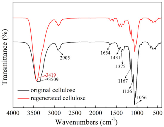 Figure 6 showed the FT-IR spectra of original and regenerated cellulose. The two spectra were basically the same without new peaks observed in the regenerated cellulose, which demonstrated that the main functional groups in cellulose were not changed and no chemical reaction occurred during the dissolution ([AAeim][OAc]/DMSO co-solvent) and regeneration processes. The peaks located at 3419 cm−1 and 2905 cm−1 were assigned to the stretching vibration of O–H and C–H band in the cellulose macromolecule, respectively. The bands around 1167 cm−1 and 1126 cm−1 were caused by stretching vibrations of the C–O–C band in the original cellulose [36]. In addition, the symmetric bending vibration and swing vibration of –CH2 could be seen at 1431 cm−1 and the bending vibration of the C–H bond could be seen at 1375 cm−1. After being regenerated, the O–H vibration shifts to a higher wavenumber (3509 cm−1), indicating that the breaking of hydrogen bonds weakened the bonding force during the dissolution [37]. The presence of all of the above bands suggests that the dissolution of cellulose in the [AAeim][OAc]/DMSO co-solvent system is a physical process.