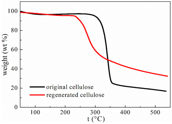 Thermal decomposition profiles of the original cellulose and the cellulose regenerated from the developed [AAeim][OAc]/DMSO co-solvent system are shown in Figure 7. It is apparent that the two profiles are almost overlapping at a lower temperature and that the rapid decomposition occurs in the temperature ranging from 285 °C to 351 °C for the original cellulose and 240 °C to 305 °C for the regenerated cellulose. The weight losses over these temperature ranges were mainly caused by the breaking of the glycosidic bonds and part of the glucose units in the cellulose molecules. Compared with the original cellulose (onset temperature Tdcp = 285 °C), the regenerated cellulose exhibits a slightly lower onset temperature (Tdcp = 240 °C). The lower Tdcp means a lower thermal stability. The decrease in the thermal stability of the regenerated cellulose may be attributed to the decreased number of hydrogen bonds between cellulose chains and crystallinity. Similar observations have been reported by Pang et al. [38] and Xu et al. [21] during the dissolution of cellulose in ionic liquid. However, the regenerated cellulose has a slightly higher char yield (nonvolatile carbonaceous material) on pyrolysis than that of the original cellulose, indicated by the slightly higher residual mass after the decomposition step [39].