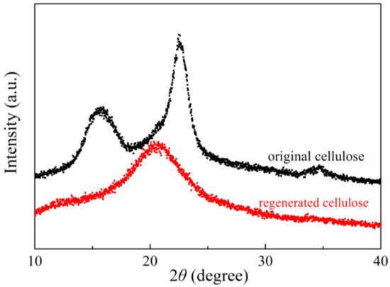 Figure 8 shows the XRD spectra of the original and regenerated cellulose. The diffraction peaks at 2θ = 16.50°, 22.96° and 34.84° that appear in the XRD spectra indicate the typical structure of cellulose I [40]. After dissolution and regeneration in the developed [AAeim][OAc]/DMSO co-solvent system, the intensity of the diffraction peaks at 2θ = 13°and 21° was weakened, indicating that the crystallinity of cellulose decreased and its crystalline structure changed from I to II [41]. This may be due to the rapid proton exchange of the hydroxyl groups with the solvent molecules during the cellulose dissolution process, resulting in an unrecovered hydrogen bond network structure. However, the DP of the regenerated cellulose (462) is nearly equal to that of the original bamboo dissolving pulp cellulose (DP = 650), implying that the macromolecular chain of the cellulose is less damaged during the dissolution and regeneration process.