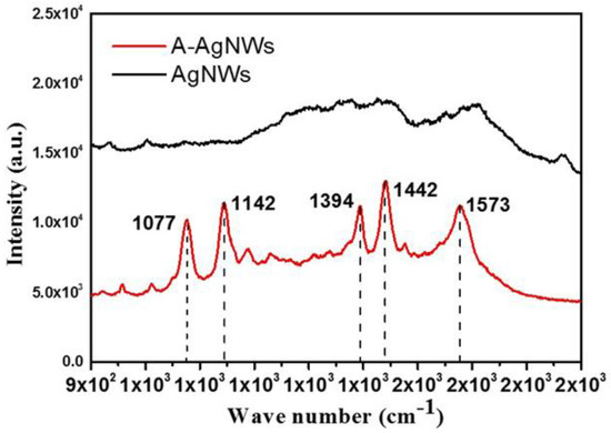Raman spectra of AgNWs and A-AgNWs are shown in Figure 2. From the result, it can be seen that the spectra of two substances visibly varied from each other. The spectrum of AgNWs obtained indistinct peaks at around 1390, 1440 and 1580 cm−1, which correspond to the stretching vibration of the C–N, and C–C bonds and in-phase vibration of the C–C bond that exist in PVP absorbed on the surface of AgNWs. After the amination, these aforementioned peaks become more intense, suggesting that the introduction of PATP brought more C–N and C–C bonds. In addition, new peaks at 1077 and 1142 cm−1 can be clearly observed, which correspond to the a1 vibrational modes (in-plane, in-phase modes) of the C–S bond and b2 modes (in-plane, out-of-phase modes) of the C–C bond, respectively. The former result could be further proof of the existence of PATP, while the latter can be ascribed to the charge transfer of the metal to the adsorbed molecules and demonstrates that PATP in these cases adopts a perpendicular orientation to the metal surface, which means that PATP is attached on the smooth silver surface with its sulfur atom by forming a chemical bond.