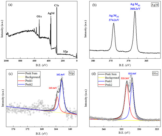XPS spectra of A-AgNWs: (a) survey; (b) Ag 3d; (c) S 2p; and (d) O 1s high resolution spectrum.