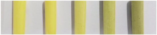 Polyimide aerogels cross-linked by A-AgNWs were obtained via the aforementioned methods. As shown in Figure 4, the produced aerogels are basically yellow in appearance; from left to right, the contents of A-AgNWs are 0%, 0.1%, 0.2%, 0.5% and 2.0%. The colors of aerogels differ from citrine to dark khaki, that is, the more A-AgNWs the aerogel contains, the greener it appears.