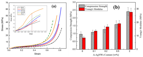 However, the addition of A-AgNWs was proven to lead to evident growth in strength and the Young’s modulus. As shown in Figure 7b, comparing with PI-0 which processes a compression strength of 0.97 MPa, PI-0.1 showed 12% growth at 1.09 MPa, which rose by 12.4%. Furthermore, when A-AgNW content was added up to 2.0 wt %, the compression strength of aerogels significantly increased to 2.41 MPa which improved by 148% with respect to aerogels with no A-AgNWs. Young’s modulus stats show a similar pattern to aerogels with 2.0% A-AgNW’s own modulus of 27.66 MPa, which was 223% more than Young’s modulus of blank samples. AgNWs endowed great improvement in strength, homogenously dispersed among aerogels, which was quite convictive according to the test results.