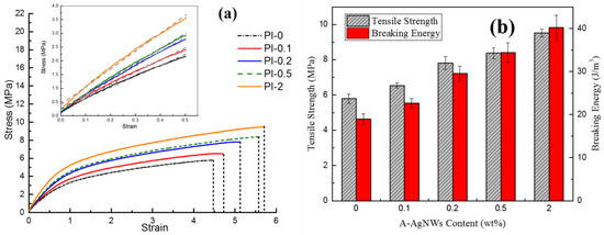 Figure 8a,b show the results of tensile tests for aerogels; with the increasing addition of A-AgNWs, tensile strength and modulus showed evident growth, similar to the compression experiment. Comparing with PI-0 which had a strength of 5.79 MPa, PI-0.1 showed 13% growth at 6.54 MPa. When A-AgNW content was added up to 2.0%, the tensile strength reached 9.52 MPa which was a 64% increase compared to the control sample. In addition, the elongation at the break showed a relatively remarkable increase as shown in the curves; by integrating each curve, the breaking energies of every sample are shown in Figure 8b. The breaking energy results indicated that the presence of A-AgNWs could significantly improve the strength and toughness of aerogels at the same time, which is rarely achieved.
