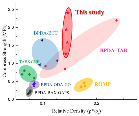 The reason why A-AgNWs greatly improved both the strength and toughness of aerogels simultaneously may be seen from two aspects. On the one hand, AgNWs orientated randomly in polyimide aerogels; these two constituents formed metal-enhanced polymer composite, where silver nanowires served as tough and rigid metallic reinforcement to enhance the strength of the polyimide matrix. This is highly consistent with the results of compression tests. On the other hand, owing to its high aspect ratio and surface area, AgNWs possessed a lot of cross-linking points after being modified with PATP, which leads to a sufficient cross-linking reaction between A-AgNWs and polyimide. In that case, with the increase of A-AgNW contents, the cross-linking density increased significantly, which led to great improvement in the mechanical properties of PI aerogels, especially with regard to the toughness of aerogels. We compared our mechanical properties results with several authoritative studies on PI aerogels, as shown in Figure 9. The samples in this study show comparatively high compression strength with similar densities.
