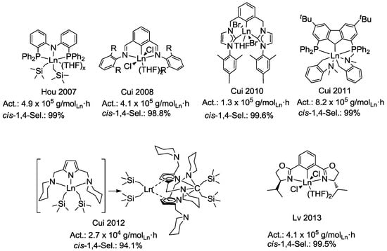 - Lv, K.; Cui, D. CCC-Pincer Bis(carbene) Lanthanide Dibromides. Catalysis on Highly cis-1,4-Selective Polymerization of Isoprene and Active Species. Organometallics 2010, 29, 2987–2993. [Google Scholar] [CrossRef]