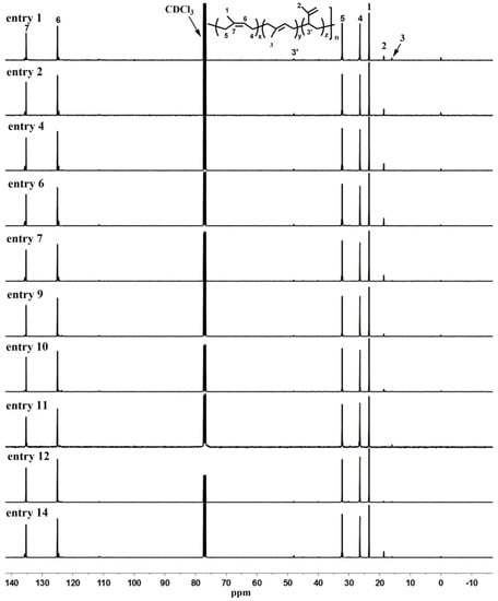 The resulting PIPs all showed good solubilities in THF and CHCl3. The 1H NMR spectra of the PIPs obtained by the complex 1–3/activator/AlR3 systems in CDCl3 indicated the main 1,4-microstructure and a trace amount of a 3,4-microstructure. The 13C NMR spectra showed diagnostic signals for a main cis-1,4 configuration (δ of 23.4, 26.4, 32.2, 125.0 and 135.2 ppm; cis-1,4-PIP selectivity of >90%) and a small amount of 3,4-configuration (δ of 18.6, 26.4, 32.2, 125.0 and 135.2 ppm) with or without a trace amount of trans-1,4-configuration (δ of 15.9, 26.4, 32.2, 125.0 and 135.2 ppm; Figure 2). GPC curves revealed that these PIPs had moderate to heavy molecular weights in the range of 77,000–710,000 g/mol and bimodal molecular weight distributions (Mw/Mn = 2.0–4.5) similar to natural rubber. The DSC curves of the resulting cis-1,4-PIPs showed the glass transition temperature in the range of −58 to −65 °C, consistent with the thermoplastic character of the CPIP (see Supplementary Materials).