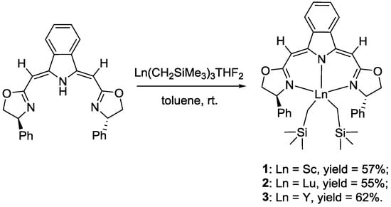 Recently, we have paid attention to the synthesis of the NNN-ligated rare-earth metal dialkyl complexes and their applications in IP polymerization. In 2013, we reported the synthesis of a series of chiral (S,S)-bis(oxazolinylphenyl)amine ((S,S)-BOPA)-ligated rare-earth metal dialkyl complexes [(S,S)-BOPA]Ln(CH2SiMe3)2 (1–2; 1: Ln = Sc; 2: Ln = Lu). In the presence of an activator with or without a small amount of AliBu3, the dialkyl complexes 1 and 2 exhibited very high activities of up to 6.8 × 105 (g of polymer)/(molLn h) and trans-1,4 selectivities of up to 100% in the quasi-living polymerization of isoprene, yielding trans-1,4-PIPs with moderate molecular weights (Mn = (0.2–1.0) × 105 g/mol) and narrow molecular weight distributions (Mw/Mn = 1.02–2.66) [38]. Recently, we also reported that the 1,3-bis(2-pyridylimino)isoindoline-ligated rare-earth metal dialkyl complexes showed very high activities of up to 1.9 × 106 (g of polymer)/(molLn h) and high cis-1,4 selectivities of >99% in the polymerization of isoprene in the presence of an activator and AlR3, affording CPIP with heavy molecular weights (Mn up to 610,000 g/mol) and narrow to moderate molecular weight distributions (Mw/Mn = 1.26–2.08) [39]. These results demonstrated that the effective adjustment of the skeleton of the pincer-type NNN ligand have an important impact on the catalyst performance of these rare-earth metal complexes in IP polymerization, which rouses our interests to explore more NNN-ligated rare-earth metal dialkyl complexes and to detect their catalytic performance in the selective polymerization of IP. 1,3-Bis(oxazolinymethylidene)isoindoline (BOXMI-H) ligand, which has structural characteristics of both the (S,S)-bis(oxazolinylphenyl)amine and 1,3-bis(2-pyridylimino)isoindoline ligands, is an interesting chiral tridentate C2-symmetric NNN ligand for the organometallic complex based on transition metals for the asymmetric reaction [40,41,42,43]. Until now, the BOXMI-H-ligated rare-earth metal complexes have never been reported, and their applications for the coordination–insertion polymerization of olefin have never been investigated, as far as we are aware. Herein, we report the synthesis of three pincer-type BOXMI-H-ligated rare-earth metal dialkyl complexes (BOXMI)Ln(CH2SiMe3)2 1–3 (1: Ln = Sc; 2: Ln = Lu; 3: Ln = Y) via the acid–base reaction between the BOXMI-H ligand and rare-earth metal trialkyl complexes. These complexes 1–3 exhibited high activities of up to 6.8 × 104 (g of polymer)/(molLn h) and high cis-1,4 selectivities of up to 97% in the IP polymerization in toluene, affording cis-1,4-polyisoprenes with heavy molecular weights (Mn of up to 710,000 g/mol) and bimodal molecular weight distributions (Mw/Mn = 2.0–4.5).