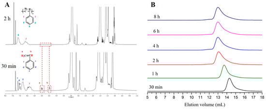 (A) 1H-NMR spectra after 30 min. and 2 h (100% conversion) {[t-BuP2]/[sec-BuLi]:1/1, styrene}; (B) SEC traces obtained from withdrawn aliquots at different time intervals during the [t-BuP2]/[sec-BuLi]:1/1 polymerization of styrene.