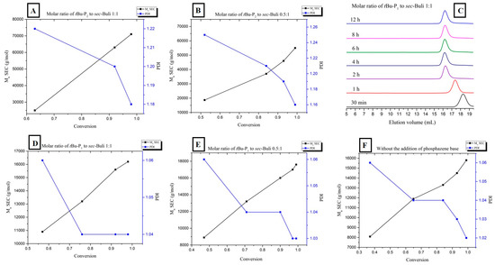 (A,B) Relationship between number-average molecular weight (black line) and polydispersity (blue line) vs. monomer conversion during the 1:1 and 0.5:1 [t-BuP2]/[sec-BuLi] polymerization of styrene; (C) SEC traces obtained from withdrawn aliquots at different time intervals during the [t-BuP1]/[sec-BuLi]: 1:1 polymerization of styrene; (D,E) Relationship between number-average molecular weight (black line) and polydispersity (blue line) vs. monomer conversion during the 1:1 and 0.5:1 [t-BuP1]/[sec-BuLi] polymerization of styrene; (F) Relationship between number-average molecular weight (black line) and polydispersity (blue line) vs. monomer conversion during the polymerization of styrene in the absence of phosphazene superbase.