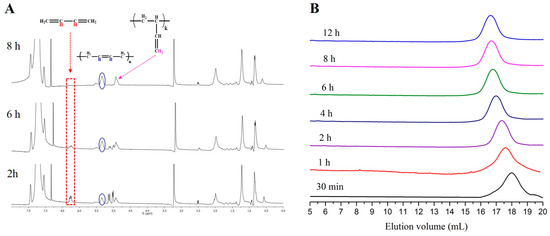 (A) 1H-NMR spectrum after 2 h, 6 h and 8 h (100% conversion) {[t-BuP2]/[sec-BuLi]:1/1, 1,3-butadiene}, indicating the different polybutadiene microstructures; (B) SEC traces obtained from withdrawn aliquots at different time intervals during the [t-BuP2]/[sec-BuLi]:1/1 polymerization of butadiene.