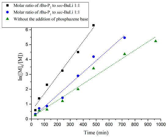 One experiment (Table 1, Entry 1) was performed using [t-BuP4]/[sec-BuLi] in a molar ratio 1:1. In this case, high molecular weight (297,000 g/mol) with high polydispersity (Ð > 1.9) (Figure S1) was obtained in 20 min, suggesting that the basicity of t-BuP4 (pKa, ACN = 42.6) leads to fast but uncontrollable polymerization of styrene (Figure 1, Black line). The big radius of the phosphazeniun lithium cation (~5 Å) [43,44] increases the interionic distance from the propagating anionic sites, generating extremely reactive carbanions, due to the delocalization of the positive charge over 17 positions in t-BuP4. We assume that during the polymerization either two active populations (aggregated non-active and active initiating species) coexist or the active species partially deactivated by the t-BuP4 and thus the produced polymers exhibit extremely high molecular weight and broad polydispersity. As a consequence, the viscosity of the solution was raised rapidly within 20 min, rendering the monitoring of the polymerization difficult. Further experiments are in progress to explain this complex phenomenon.
