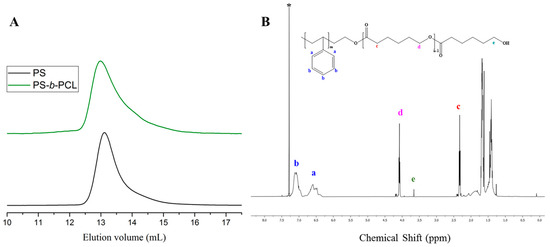 (A) SEC traces of PS (black line) synthesized by [t-BuP2]/[sec-BuLi]:1/1 and of the corresponding PS-b-PCL (green line); (B) 1H-NMR spectrum of the final diblock copolymer in CDCl3.