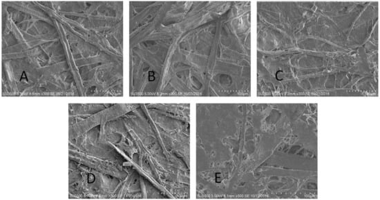 (A) SEM (Scanning Electron Microscope)) of the blank handsheet, 300× magnification; (B) SEM of the sample vanillic acid, without CPX (Chitosan), 300× magnification; (C) SEM of the sample 1,2–DHB (Catechol) without CPX, 300× magnification; (D) SEM of the sample gallic acid without CPX, 300× magnification; (E) SEM of the sample gallic acid with CPX, 300× magnification.
