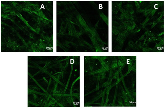 Morphology was assessed by two different microscopies, that is, SEM and confocal microscopy. The blank and all the papers were first observed by SEM. Figure 1A–C displays the hand sheets obtained without mediator and using VA and 1,2–DHB. In Figure 1D,E, the micrographs for GA with and without CPX are shown.