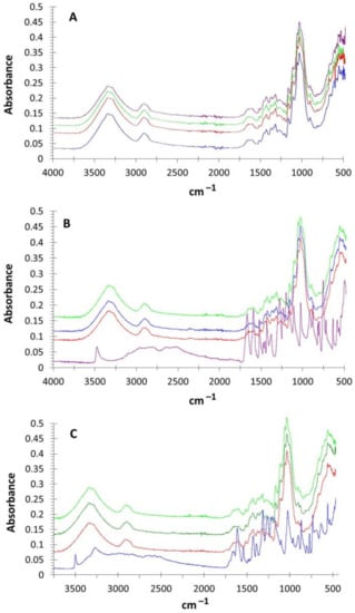 In Figure 3B,C, the spectra for papers treated with vanillic and gallic acids are shown. Bands specified in Table 2 are found for all the papers tested. There was no increase in the aromatic, ether and carboxyl signals (C–O and C=O) for all the samples modified by the VA system and GA system. No increase in the methoxyl bands was observed. The presence of the lignin bands (aromatic ring) showed that there was no depolymerization of the lignin by the laccase. In all cases, chitosan signals were observed, especially in the bands that follow: 1590 cm−1 assigned to N–H bend in secondary amine; 1654 cm−1 assigned to N–H bend in primary amine; 3460 cm−1 assigned to N–H constriction.