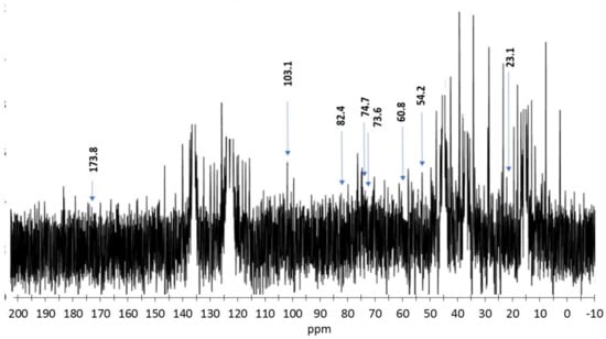 The 13C-nuclear magnetic resonance spectrum is displayed in Figure 4. Detailed analysis of carbon-specific functional-group signals are presented in Table 3.