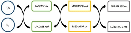 Conventionally, laccases were used for delignification in the bleaching process of paper [31,32]. As they can depolymerize the lignin structure, they also can undergo coupling and insertion reactions [12,33]. The mechanism is similar to the one involved in lignin synthesis. Laccases perform a one-electron oxidation of the substrate. Once oxidized (laccase ox), it interacts with the phenolic substrate (mediator or any other substrate with lower chemical potential) to generate the oxidized species (Scheme 1).