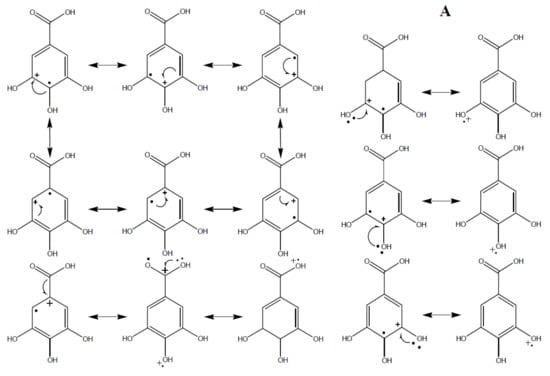 (A) Resonance structures of gallic acid radical; (B) resonance structures of vanillic acid radical; (C) resonance structures of catechol.