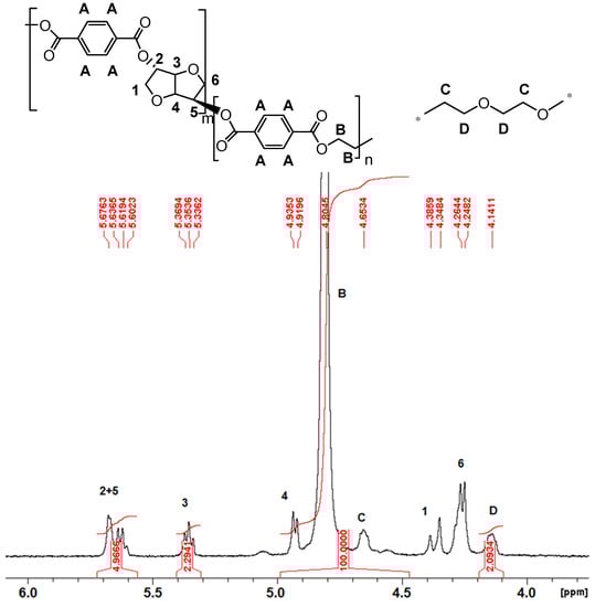 NMR spectra of a typical poly(ethylene terephthalate-co-isosorbide terephthalate) PEIT (entry 2) in the 4–6 ppm zone and assignments.