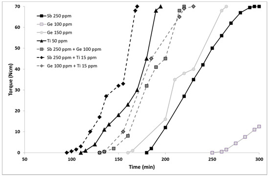 Results of the synthesis of poly(ethylene terephthalate-co-isosorbide terephthalate) starting from the oligomers and using bimetallic combinations are presented in Table 1 in comparison with the single metal catalysts, which were also determined in this study. The catalyst quantity is fixed on the basis of PET catalysis (classical conditions: Ti 8 ppm, Ge 80 ppm and Sb 250 ppm), a little higher in some cases as isosorbide is expected to react slowly. Sb2O3 (entry 2) leads to a number-average molecular weight around 34,000 g/mol with a dispersity around 2 within our experimental conditions. These values can be compared to an experiment conducted without catalyst and stopped at 300 min (entry 1). The microstructure is composed of ca. 9% isosorbide together with DEG content at ca. 2%. A titanium alkoxide was then assessed (entry 3). The number-average molecular weight and ηred of the polymer obtained using 50 ppm titanium tetraisopropoxyde are higher than those obtained using 250 ppm Sb2O3 (entry 2). The thermal properties of the polymers are given in Table 2. DSC analyses show that the glass transition temperature (Tg) of the sample obtained using the Ti catalyst is close to, but still smaller than that of the PEIT synthetized using Sb2O3. This might be linked partially to a slightly lower content of isosorbide, around 8%. Experiments performed using germanium oxide as catalysts show that 150 ppm of GeO2 (entries 4–5) are required to reach polymer properties similar to those of entries 2 and 3. If the nature of the metal does not significantly influence the amount of diethylene glycol units in the resulting PEIT, Sb leads to the highest isosorbide content, ca. 1% higher than Ge and Ti. In terms of colouration, the titanium catalyst leads to the highest yellowness index, likely due to an increase in degradation commonly observed when using such catalysts. The increase in yellowing indicates degradation that could also explain in part the decrease in Tg values observed. We were further interested in the kinetics of these transesterification reactions. The evolution of the torque in the course of the reactions represented in Figure 2 shows that the reaction is significantly faster using the titanium catalyst, with an interesting t0 value (time corresponding to the apparition of the torque curve in Figure 2) 50 to 75 min lower than that observed for germanium and antimony, respectively.