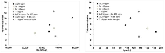 Bimetallic systems were then assessed. The Sb/Ge combination leads to a higher reaction rate than that observed using the metals alone (see Figure 3 and entry 6 vs. 4 and 2). Similar molecular weights and thermal data are obtained, with intermediate isosorbide incorporation and a lower diethylene unit content. The most important improvement is the coloration with a yellowing index lower than that obtained using the metals alone. A significant synergy can thus be noticed between these two metals, resulting in the best yellowness index/molecular weight combination of this study. This is presented in Figure 3, left. When antimony is combined to 15 ppm titanium, a very fast reaction is observed, with a t0 of 95 min, resulting in the best yellowing index/t0 combination (see Figure 3, right). The coloration remains indeed acceptable, yet still higher than that of antimony alone, with a yellowing index of 7.3. Other polymer characteristics are similar to those obtained using the Sb/Ge combination. The Ge/Ti combination was finally assessed. If rather high molecular weights are obtained, this combination leads to coloration concerns with a yellowing index higher than 12 and a glass transition temperature of 86 °C. The kinetic is similar to the Sb/Ge but lower to the Sb/Ti. Among the three combinations, a good match is thus observed when combining antimony with titanium or with germanium, while a mismatch effect is observed between Ge and Ti, as seen in entry 3.