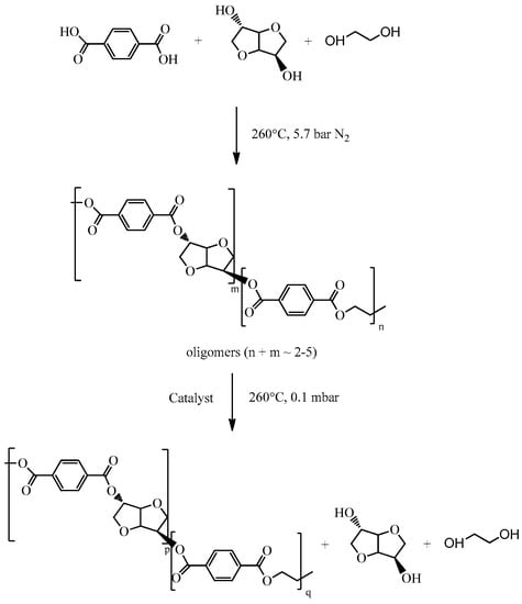 - Bersot, J.C.; Jacquel, N.; Saint-Loup, R.; Fuertes, P.; Rousseau, A.; Pascault, J.P.; Spitz, R.; Fenouillot, F.; Monteil, V. Efficiency Increase of Poly(ethylene terephthalate-co-isosorbide terephthalate) Synthesis Using Bimetallic Catalytic Systems. Macromol. Chem. Phys. 2011, 212, 2114–2120. [Google Scholar] [CrossRef]